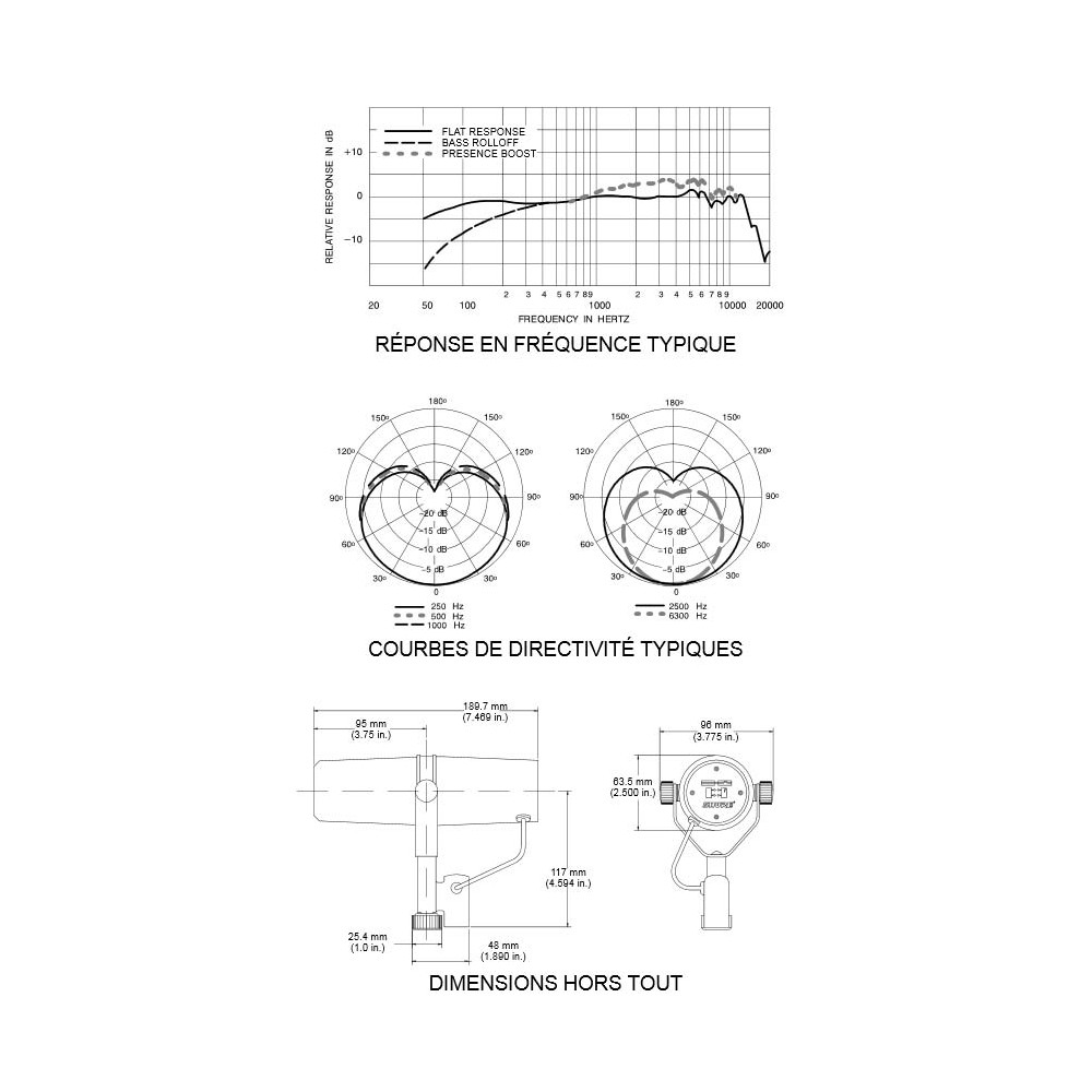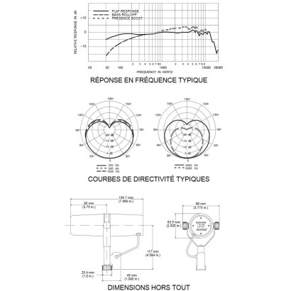Capsule : Dynamique avec blindage magnétique Réponse en fréquence : 50Hz à 16kHz Directivité : Cardioïde Impédance de sortie : 150 Ohms Sensibilité : -59 dBV/Pa (1,12mV) Filtre : Coupe-bas et amplification des médiums commutables Dimensions : micro : Ø 63,5 mm - L 190 mm ; pince articulée : 96 mm – 117 mm Poids : 765 g