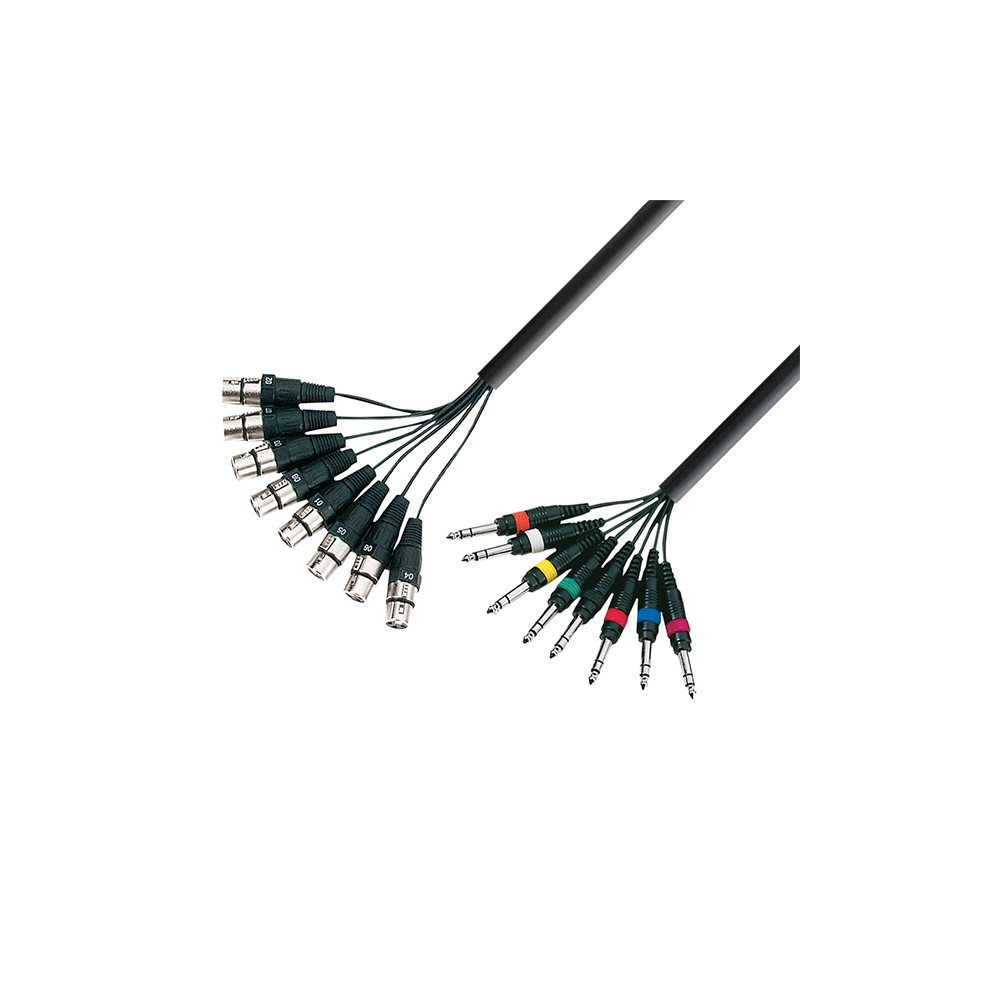 Câble multipaire 8 paires, utilisation en studio ou sur boîtier de scène avec sollicitations modérées, équipé à une extrémité de 8 XLR femelles Adam Hall et à l'autre de 8 jacks TRS 6,35 mm. Numérotation individuelle des paires, imprimée sur les gaines, plus repérage par couleurs sur les connecteurs jack.