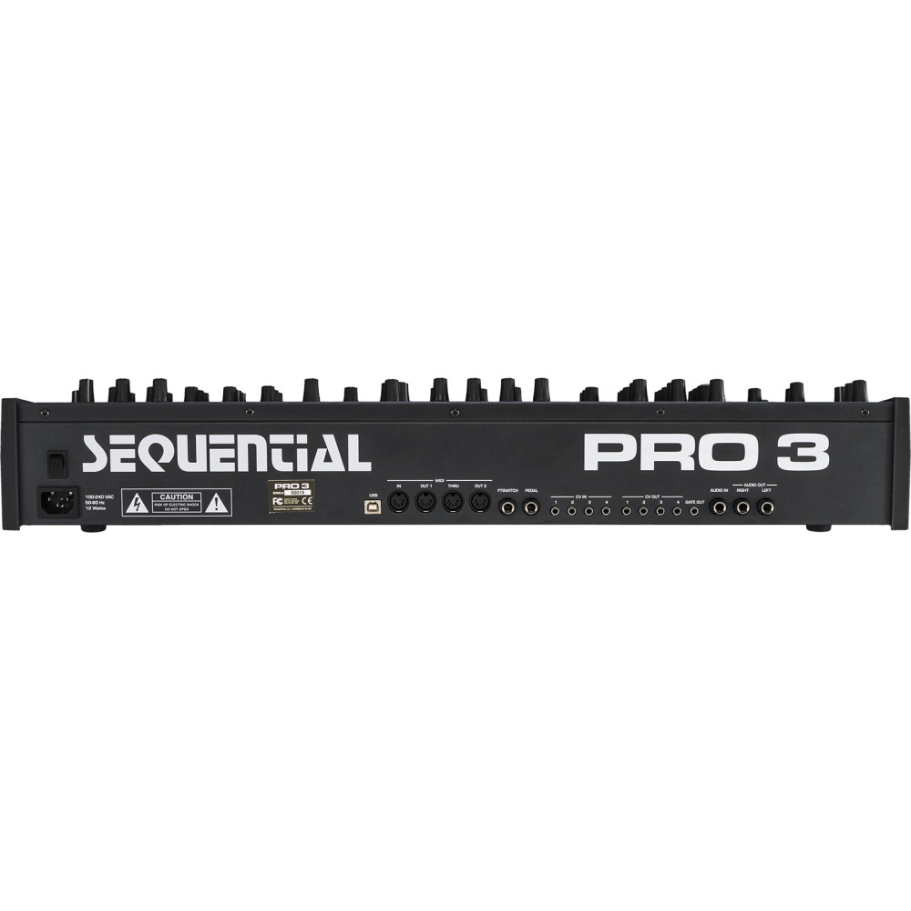 L’ensemble de fonctionnalités du Pro 3 est complété par un arpégiateur multimode, trois LFO, quatre enveloppes de retard ADSR + bouclables, deux effets numériques (retards, réverbérations et divers effets temporels), un feedback accordé, une distorsion analogique et des possibilités de modulation étendue. Les LFO, le délai et l’arpégiateur peuvent être synchronisés avec l’horloge interne ou une horloge MIDI externe. Un curseur tactile et des molettes de pitch et de modulation sensibles à la position programmables offrent un contrôle nuancé des performances en direct. Le synthé est également capable de fonctionner en mode paraphonique à 3 voix. Cela permet de jouer des accords à 3 notes où les trois oscillateurs individuels partagent un filtre et des enveloppes communs.
