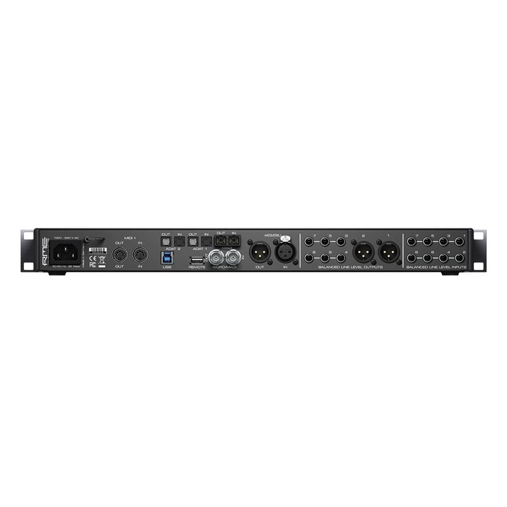 • Système numérique d’entrées/sorties USB 3.0 • 12 canaux analogiques • 16 canaux ADAT • 2 canaux AES • 64 canaux MADI • Audio 24 bit 192 KHz • Matrice 188 x 94 • 2 entrées sorties MIDI • Toutes fonctionnalités disponibles en stand alone • Pas de driver nécessaire • Télécommande MIDI • Alimentation, 100 - 240 V AC, 36 Watts • Consommation en mode oisif : 19 Watts • Consommation typique : 22-25 Watts • Dimensions avec équerres de rack : 483 x 44 x 210 mm (19’’ x 1.73’’ x 8.5’’) • Dimensions sans équerres de rack : 440 x 44 x 210 mm (17.3’’ x 1.73’’ x 8.3’’) • Profondeur totale : 240 mm (9.4”) • Poids : 3 kg ( 6.6 lbs) • Plage de temperature : +5° à+50° Celsius (41° F à 122°F) • Humidité relative : < 75%, pas de condensation