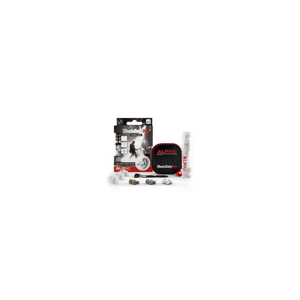 MusicSafe Pro, deux bouchons d'oreilles professionnels et un bouchon de réserve, trois paires de filtres interchangeables (atténuation 16, 19 ou 22 dB), étui de rangement Alpine de luxe, tour de cou, spray de nettoyage.