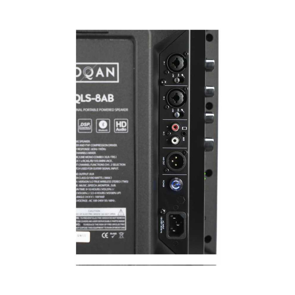 QLS-8AB Enceinte amplifiée 8'' classe D avec batterie intégrée, DSP et connectivité Bluetooth. Haut-parleur 8'' (LF) et driver 1'' (HF)2 entrées Mic/Line/Instrument avec connecteurs XLR/jack Combo 1 entrée